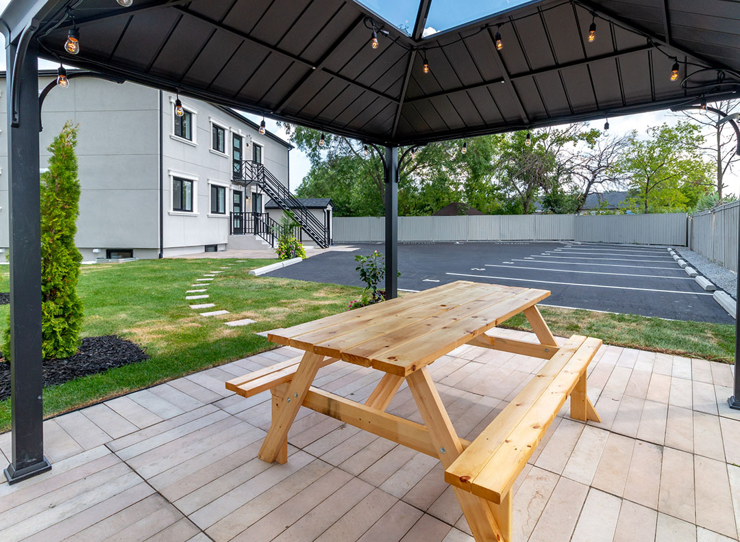 The building's exterior was updated as well with stone entrance way, inviting landscaping and backyard pergola area.